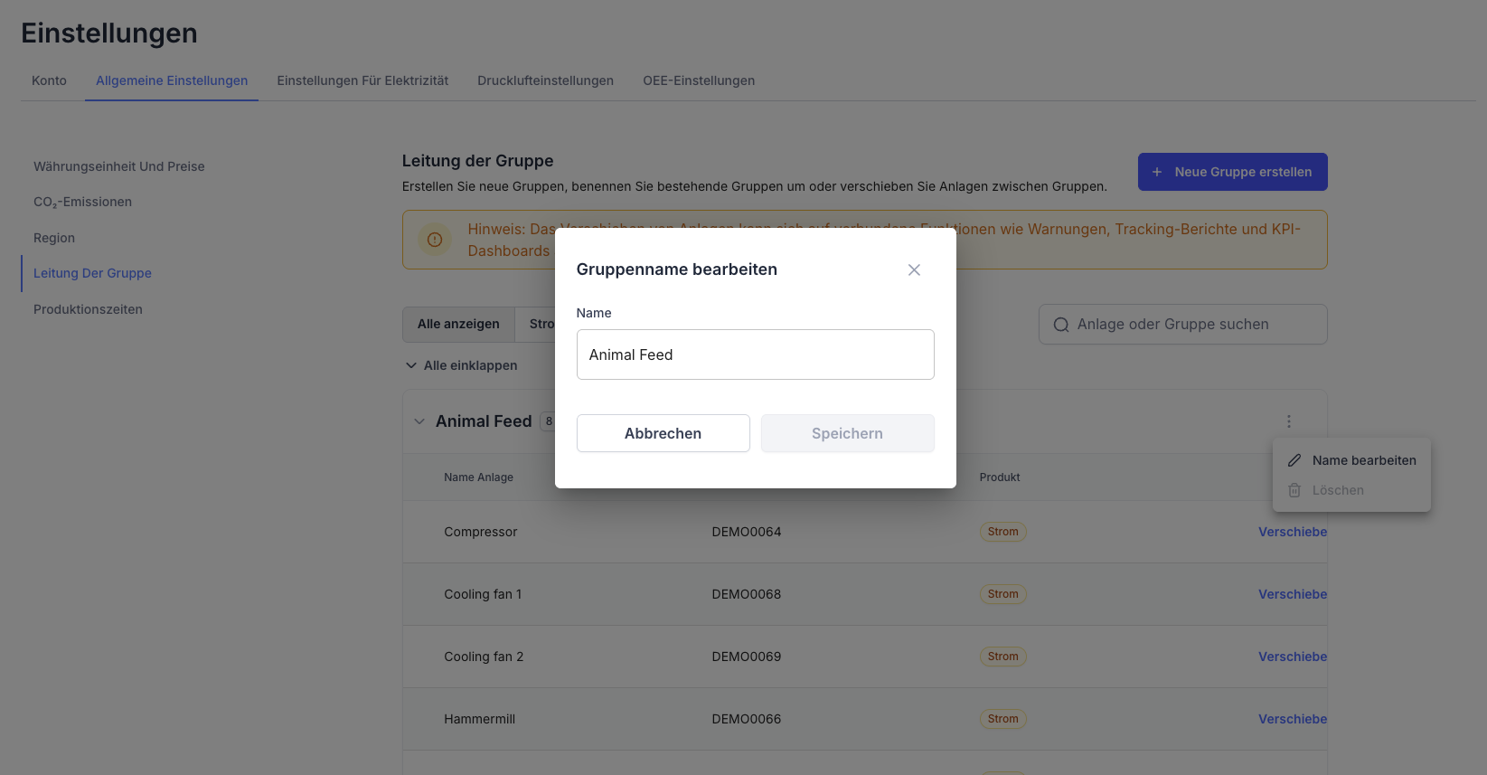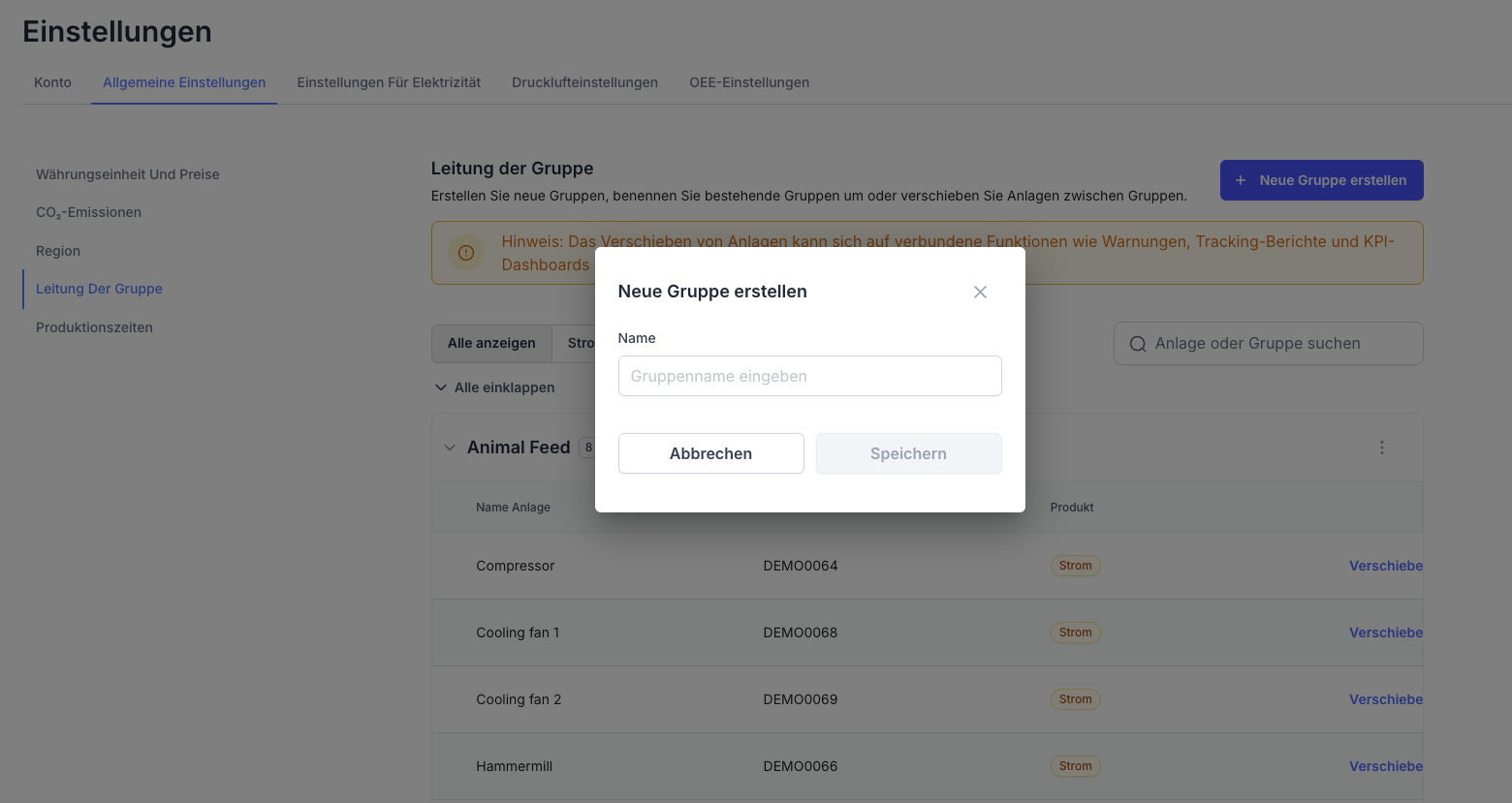 Die Gruppenverwaltung ist eine Möglichkeit, Ihre Anlagen (Assets) zu organisieren. Das Strukturieren Ihrer Anlagen in Gruppen hilft Ihnen dabei, den Überblick zu behalten und das Reporting zu vereinfachen. Sie können Anlagen beispielsweise nach Standort, Anlagentyp oder Produktionslinie gruppieren.