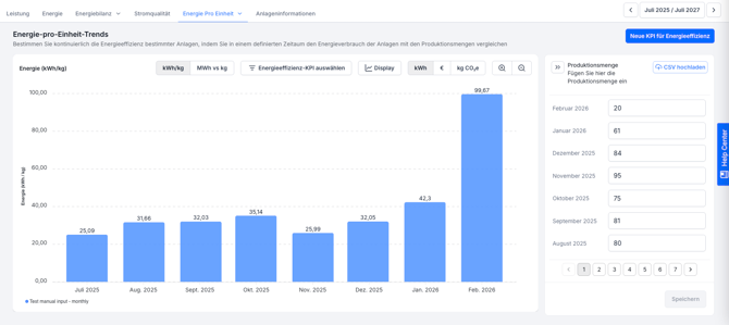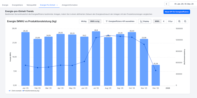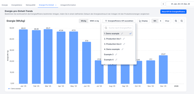 Nach der Erstellung erscheint deine Energieeffizienz-KPI in der Grafik Energie-pro-Einheit-Trends.