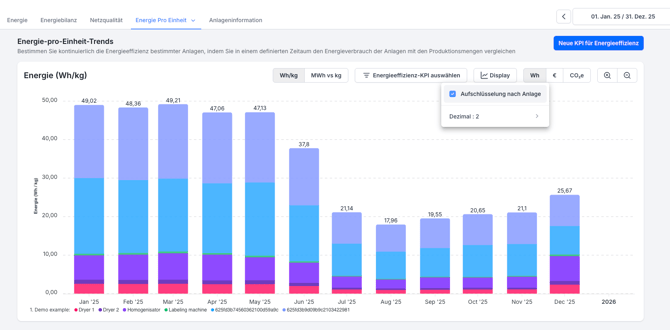 - Aktiviere „Aufschlüsselung nach Anlage“, um den Energieverbrauch pro einzelner Anlage statt als Gesamtwert anzuzeigen