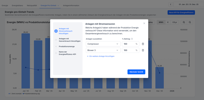 Überwachen Sie den Energieverbrauch Ihrer Anlagen pro produzierter Einheit (z. B. kWh/kg), um Verschwendung zu erkennen und Kosten zu senken.