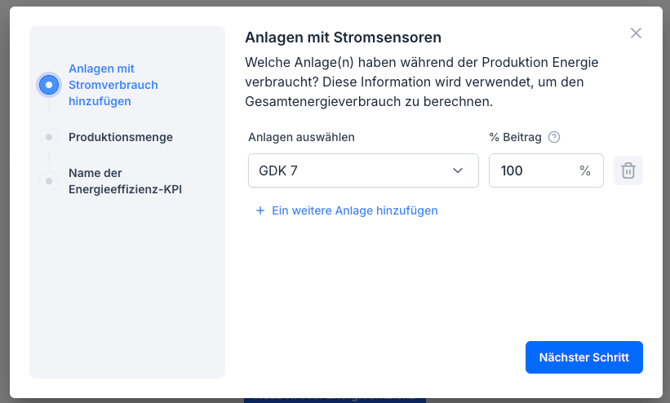- Klicke auf „Neue KPI für Energieeffizienz“. Ein Einrichtungsdialog wird geöffnet.