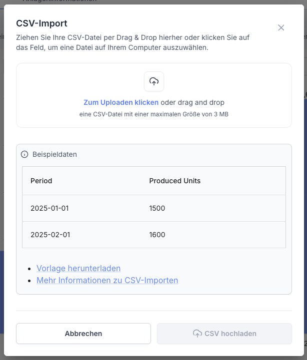 Du kannst Produktionsmengen auf zwei Arten zu einer KPI hinzufügen: manuell oder per CSV-Import.