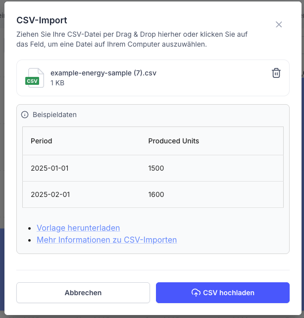 - Jede Periode darf nur einmal enthalten sein. Doppelte Perioden (z. B. 2025-12-01 zweimal) verhindern den Upload.