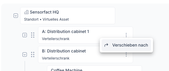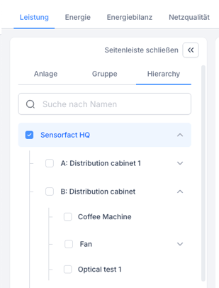 Die Energiehierarchie wird im Asset-Baum verwendet. Wechseln Sie in die Ansicht Hierarchie, um Assets entsprechend ihres elektrischen Energieflusses darzustellen.