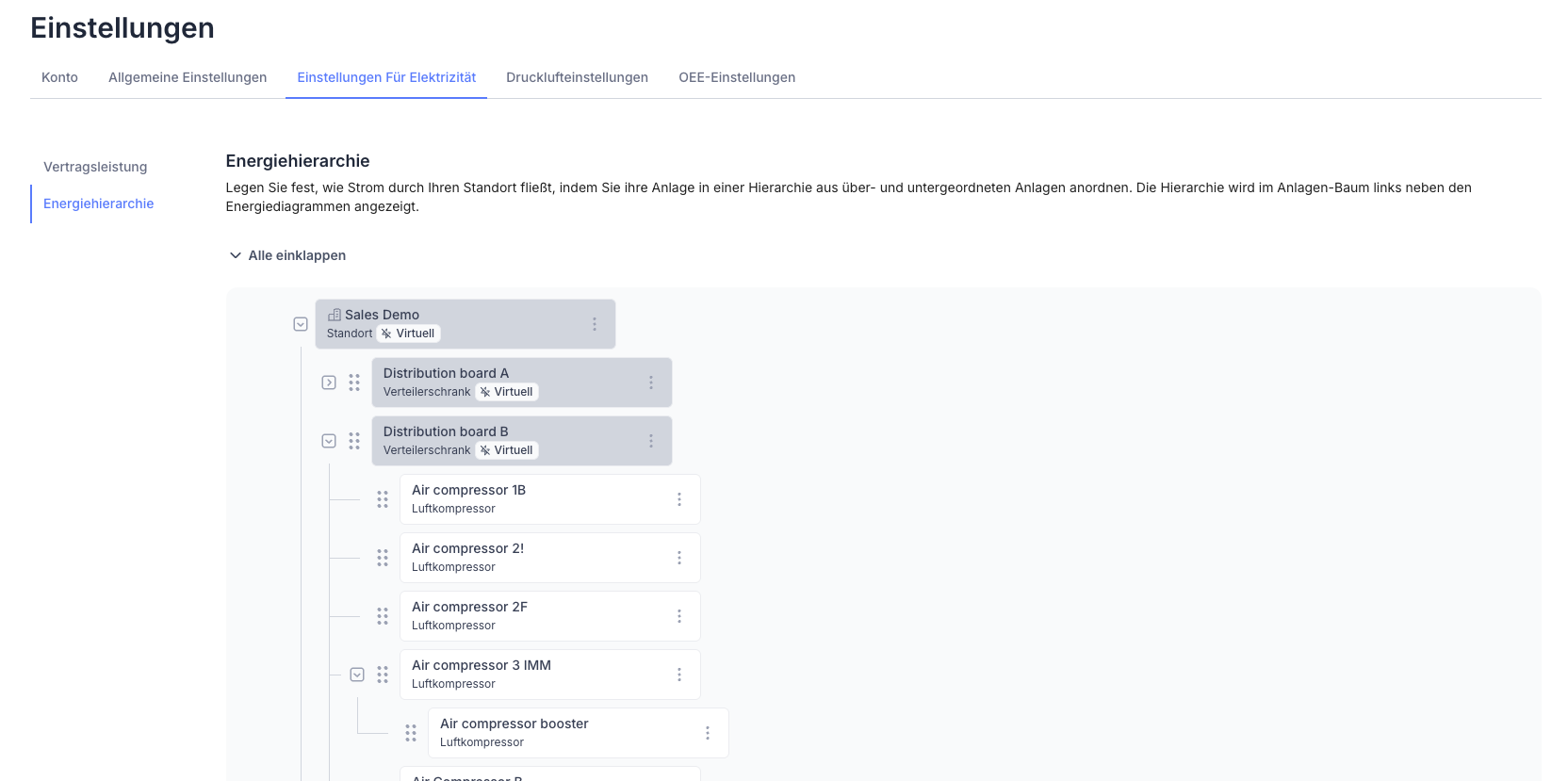 Die Energiehierarchie ist eine visuelle Baumstruktur, mit der Sie Assets durch die Definition von über- und untergeordneten Beziehungen organisieren können. Sie stellt dar, wie elektrische Energie physisch durch Ihre Anlage fließt: vom Eintrittspunkt der Energie in den Standort, über Verteilungen oder Transformatoren, bis hin zu einzelnen Maschinen.