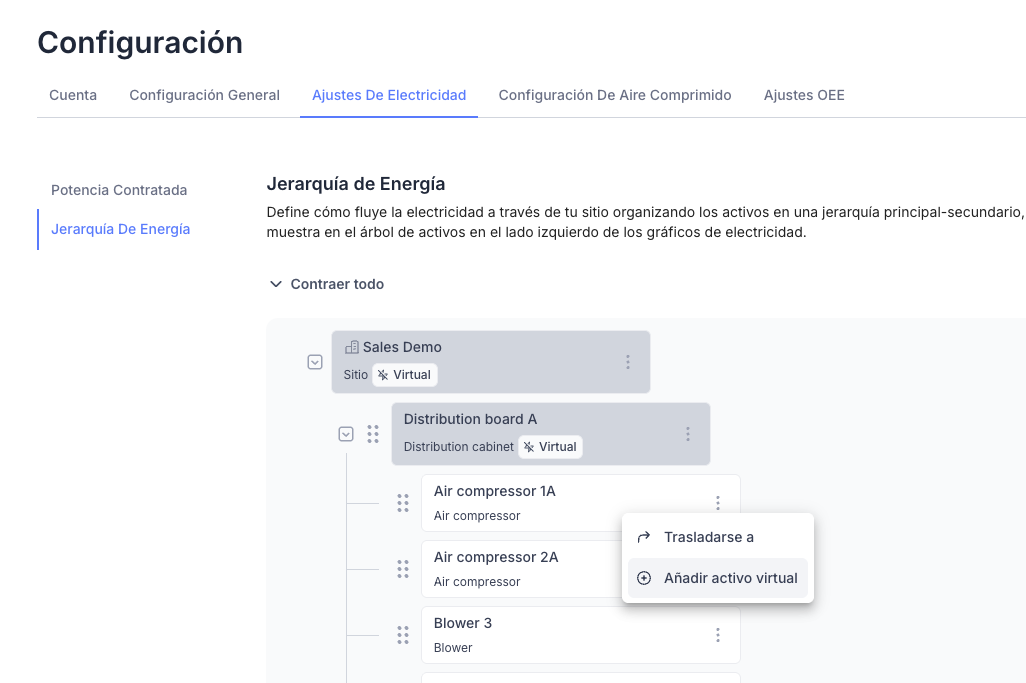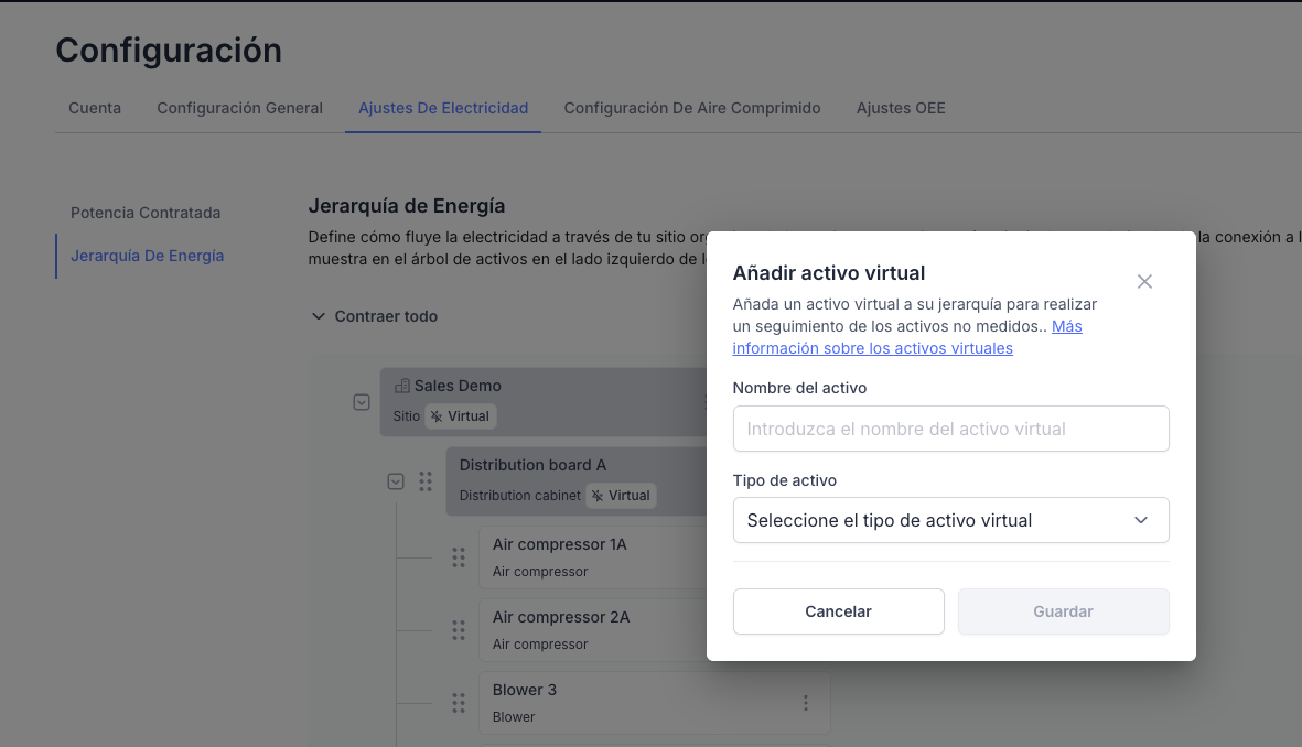 Totales automáticos: El sistema calcula automáticamente la energía de un Activo Virtual sumando los datos de todos los activos secundarios (incluyendo sensores físicos) que dependen de él.