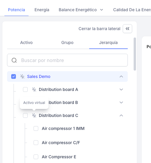 Los activos virtuales están marcados con el Icono de activo virtual para distinguirlos de los activos medidos directamente. Localícelos en el Asset Tree usando la vista de Jerarquía y en el gráfico Energy Flow.