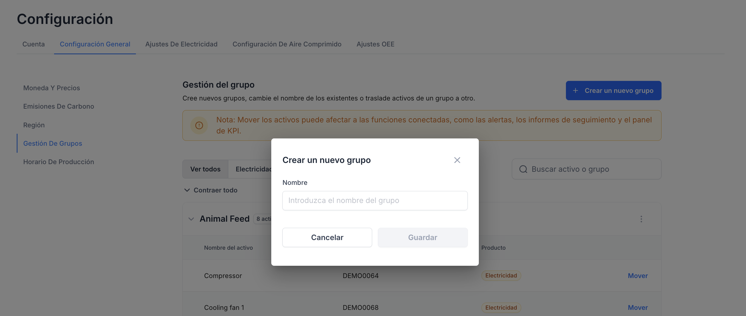 La Gestión de grupos es una forma de organizar sus activos (assets). Organizar sus activos en grupos le ayuda a mantener el orden y a simplificar la elaboración de informes. Puede agrupar activos, por ejemplo, por ubicación, tipo de activo o línea de producción.