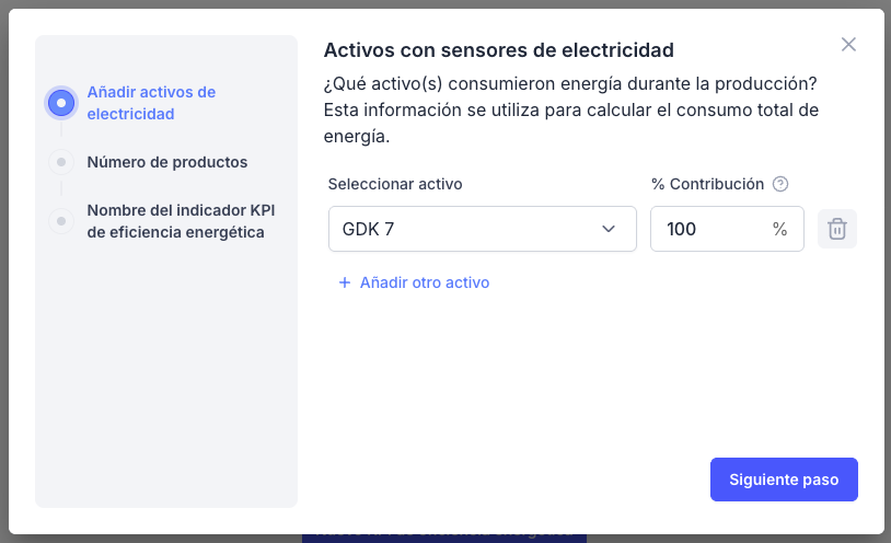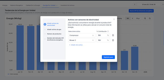 Rastree cuánta energía consumen sus activos por unidad producida (ej. kWh/kg) para identificar desperdicios y reducir costes.