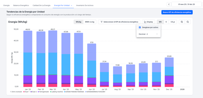 - Activa el Desglose por activo para ver el consumo de energía por activo individual en lugar del total
