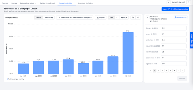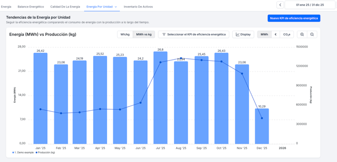 - Energía versus unidad (por ejemplo, kWh vs kg) para comparar el consumo total de energía y la producción, y obtener más contexto sobre los valores de energía por unidad