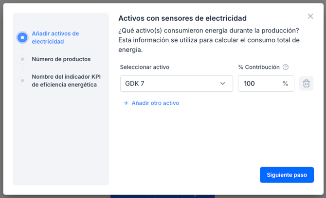- (Si aplica) Selecciona los activos de conteo que registran tu producción; o selecciona la frecuencia si vas a cargar los datos de producción manualmente o mediante CSV;