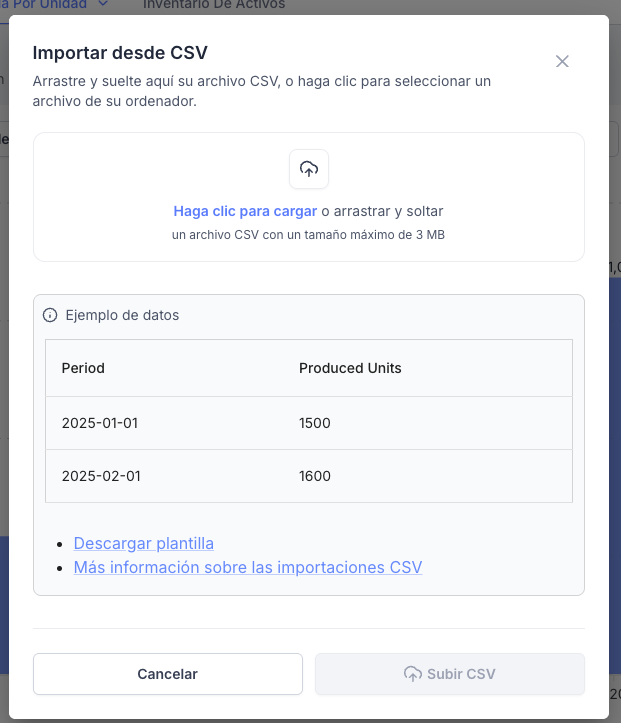 - Los nombres de las columnas deben coincidir exactamente, incluyendo las mayúsculas: “Period” y “Produced Units”.