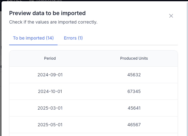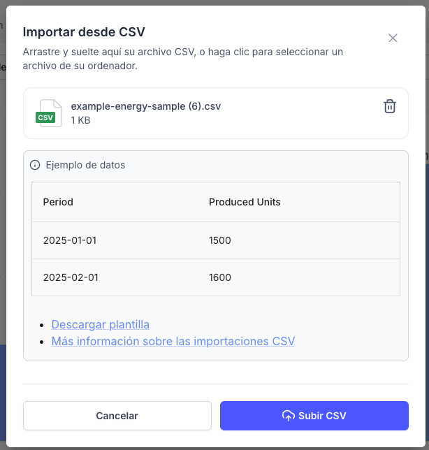 - Al utilizar la frecuencia mensual para los números de producción, es importante que el día se establezca siempre en el día 1. Por ejemplo, si desea importar datos de enero de 2026, puede usar 01/01/2026, pero no 15/01/2026.