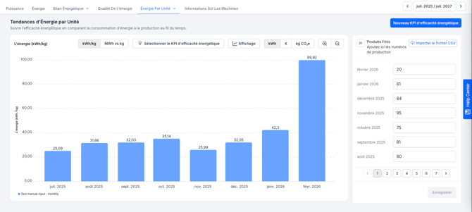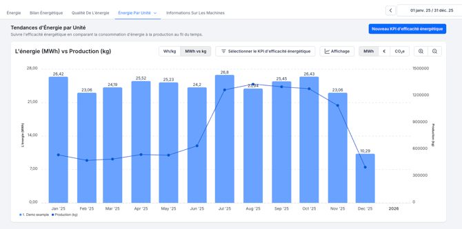 - Énergie versus unité (par ex. kWh vs kg) pour comparer la consommation totale d’énergie et la production, et obtenir plus de contexte sur les valeurs d’énergie par unité