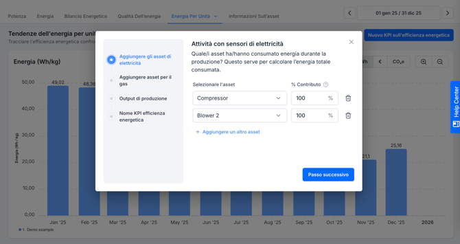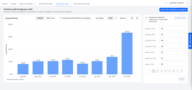 Monitora quanta energia consumano i tuoi asset per unità prodotta (es. kWh/kg) per identificare sprechi e ridurre i costi.