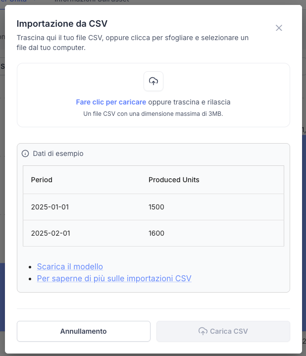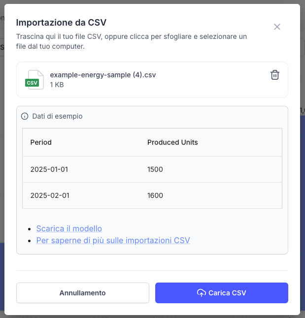 - Quando si utilizza la frequenza mensile per i numeri di produzione, è importante che il giorno sia sempre impostato sul 1°. Ad esempio, se desideri importare i dati di gennaio 2026, puoi usare 01/01/2026, ma non 15/01/2026.