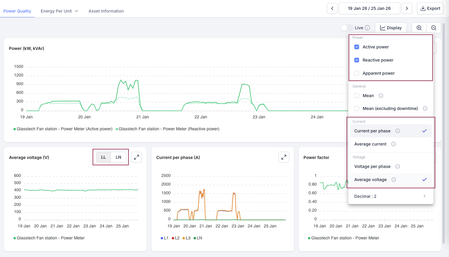- EMS - Enhanced Power Quality (Per-Phase Insights): Get a full view of your electrical health with our expanded Power Quality toolkit. For assets measured with a Power Meter, you can now monitor per-phase current and voltage, alongside reactive and apparent power, to pinpoint imbalances and inefficiencies before they lead to equipment failure.