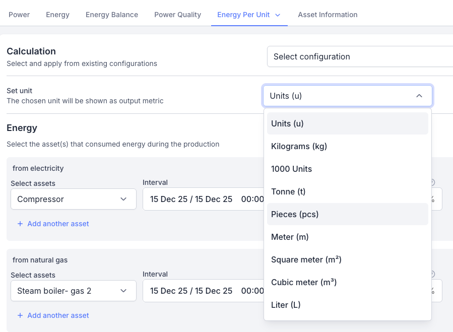 - EMS - Energy per Unit improvement: Additional unit types for production output in the 'Energy per Unit Calculation' tab are added. The added units are: Pieces (pcs), Meter (m), Square meter (m²), Cubic meter (m³), Liter (L), Tonne (t).