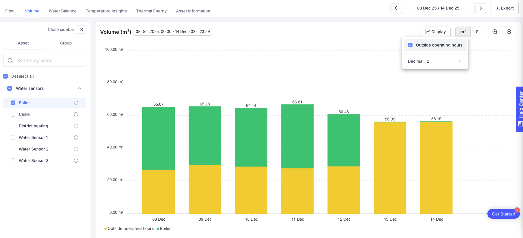 - Water - Outside Operating Hours: You can now monitor water consumption outside standard operating hours. This feature offers valuable insights into usage patterns and helps identify potential leaks and inefficiencies. To enable this feature, assets must be assigned to a Production Schedule in Settings. Enable the 'Outside operating hours' checkbox in the 'Display' menu of the Volume tab.