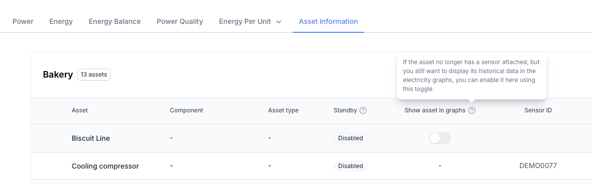 - EMS - Show data from previously measured assets: Assets that used to have a sensor attached now remain visible in the ‘Electricity - Asset Information’ tab, including a toggle to show or hide them in the electricity graphs. By default, this toggle is disabled: the asset is not visible in the asset tree of power, energy, and energy balance tabs, and not visible in the asset selector of energy per unit feature. When the toggle is enabled: the asset reappears in the asset tree of power, energy and energy balance tabs, and visible in the asset selector of energy per unit feature, making it possible to view the historical data of the asset.