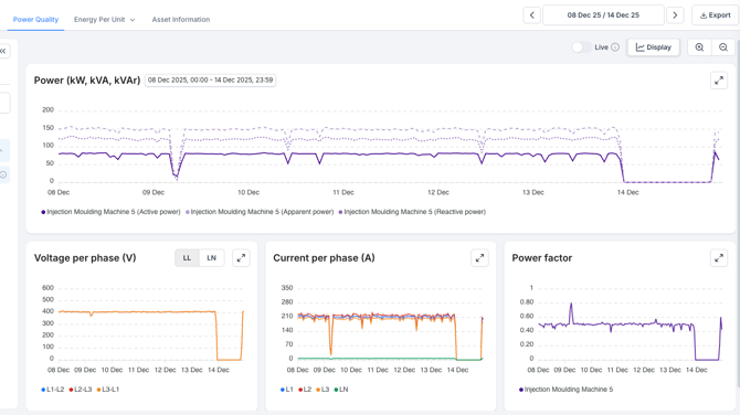 - Power Factor: Monitor the efficiency of electricity usage to uncover opportunities for optimisation. Do note: When active power is close to zero (e.g. during standby), small measurement variations have a large impact on the power factor calculation, which can cause fluctuating or unexpected values.