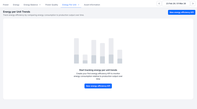 Energy per unit is a key metric that shows how much energy is consumed for each unit of production output (e.g., kWh/unit, kWh/kg). This type of energy efficiency KPI is also known as an Energy Performance Indicator (EnPI) under the ISO 50.001 energy management standard.