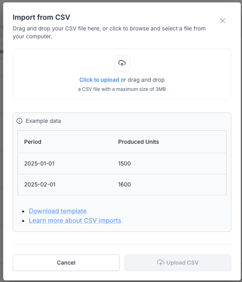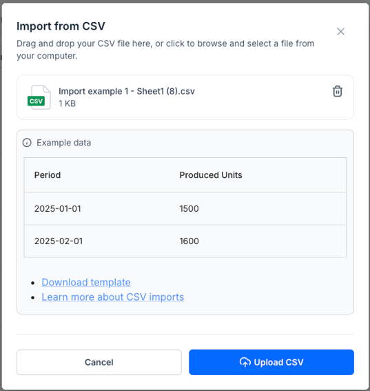 - Column names must match exactly, including capital letters: “Period” and “Produced Units”.