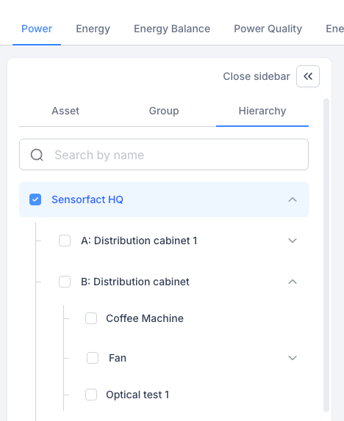 The Power Hierarchy is used in the Asset Tree. Switch to the Hierarchy view to see assets structured according to their electrical flow.