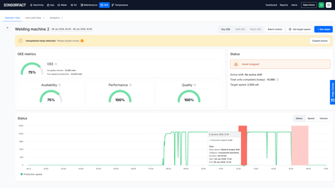 The operator view notifies users of downtime so they can provide the necessary context for each event. Whenever a stop is detected, or if there are unexplained stops from the past 24 hours, a yellow banner will appear at the top of the screen. Stops are also visualized in the status graph at the bottom of the dashboard.