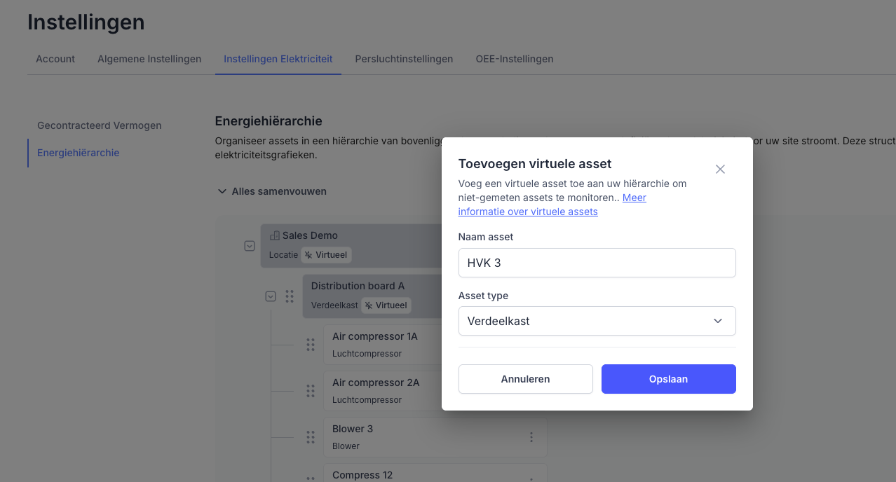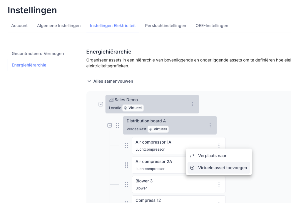 Automatische totalen: Het systeem berekent automatisch de energie voor een Virtuele Asset door de gegevens van alle onderliggende assets (die door fysieke sensoren worden gemeten) op te tellen.