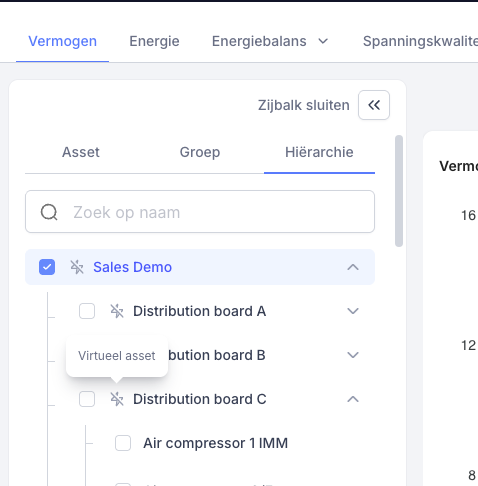 Virtuele assets zijn gemarkeerd met het Virtuele Asset icoon om ze te onderscheiden van assets die direct door een sensor worden gemeten. U vindt ze in de Asset Tree onder de Hiërarchie weergave en in de Energie Flow grafiek.
