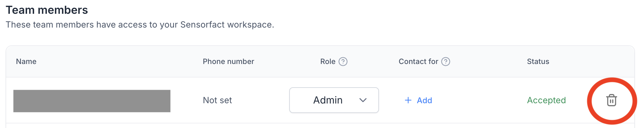 Om een teamlid te verwijderen, moet je op het prullenbak icoon klikken. Houd er rekening mee dat alleen Admin accounts de juiste rechten hebben om de teamleden te beheren.