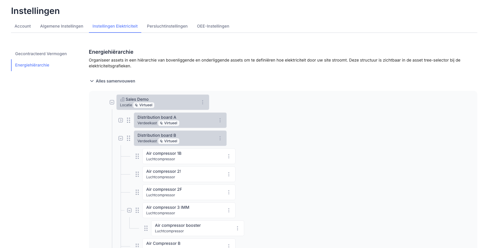 De Energiehiërarchie is een visuele boomstructuur waarmee u assets kunt organiseren door relaties tussen assets (onderliggende en bovenliggende assets) te definiëren. Het weerspiegelt hoe elektriciteit fysiek door de faciliteit stroomt: van het punt waar energie het terrein binnenkomt, via verdeelkasten of transformatoren, tot aan individuele machines.